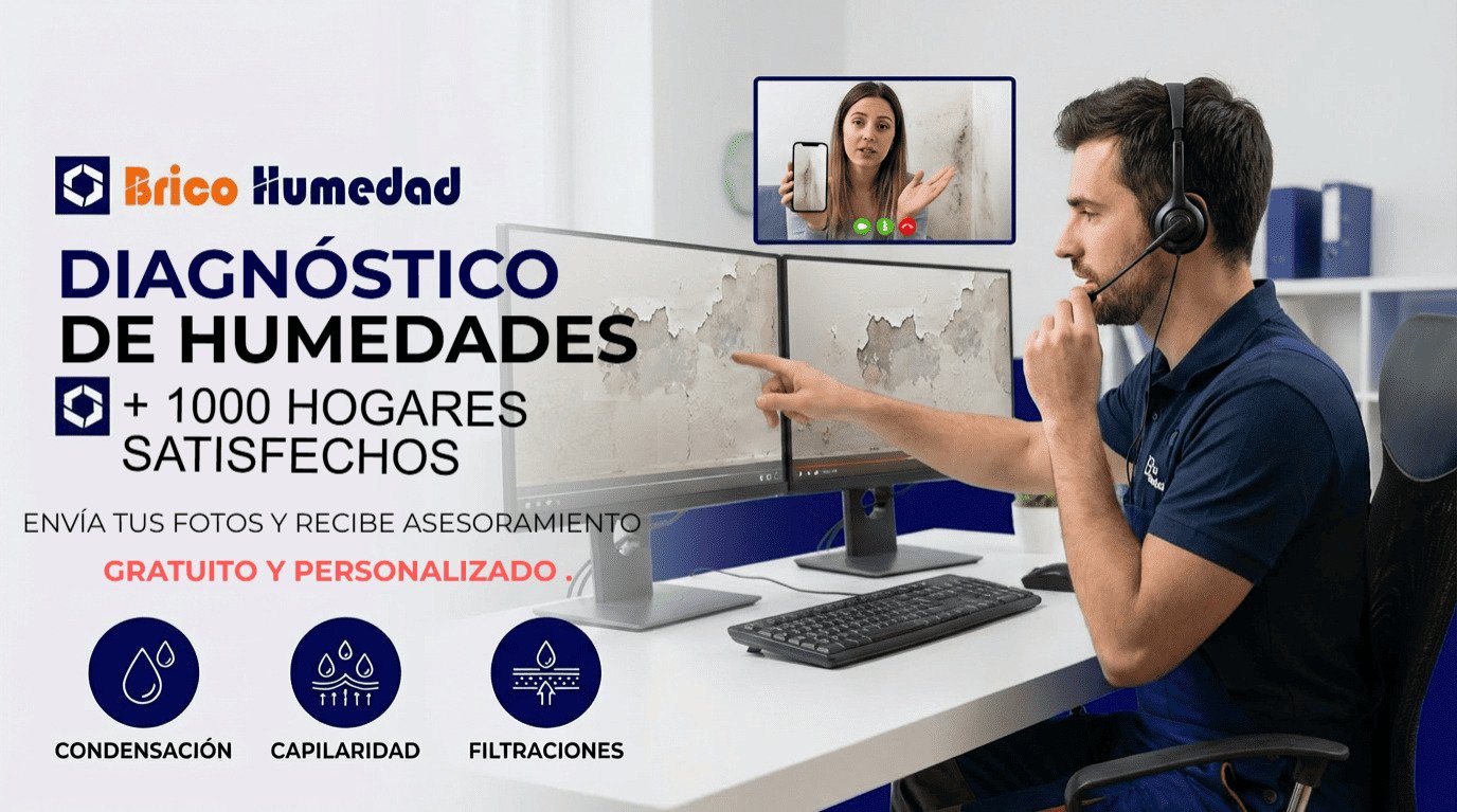 En Brico Humedad ofrecemos diagnósticos profesionales gratuitos en 24 a 48 horas por video llamada o con fotos para identificar el tipo exacto de humedad que tienes. Nuestro equipo te recomienda los mejores tratamientos y productos profesionales para eliminar definitivamente la humedad por condensación, capilaridad y filtraciones. Además, te damos un plan claro y personalizado que garantiza rapidez y resultados duraderos. No permitas que una mala decisión te cueste meses de frustración Consulta ya nuestro asesoramiento especializado y toma el control para proteger tu hogar con la confianza que ofrece un servicio profesional y transparente.